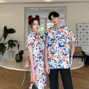 中国风情侣装复古改良不规则设计印花开叉大码旗袍连衣裙翻领衬衫