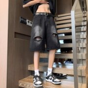 破洞牛仔短裤男夏季薄款美式高街潮牌外穿直筒裤痞帅休闲五分裤子