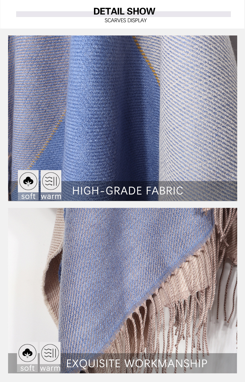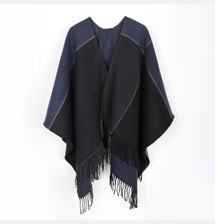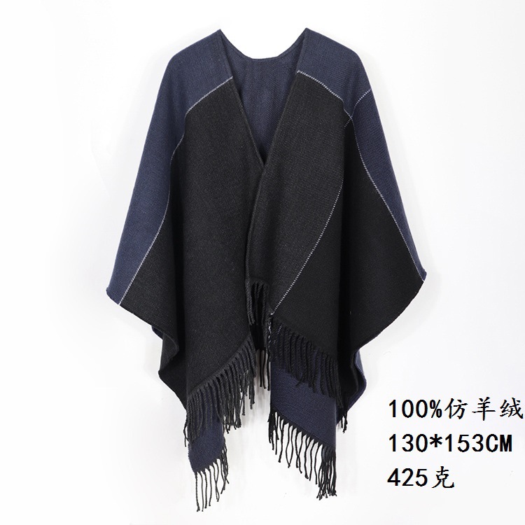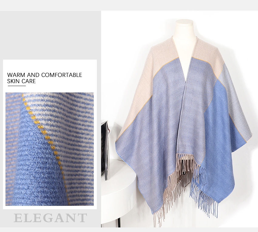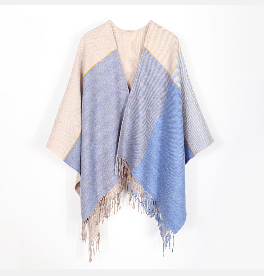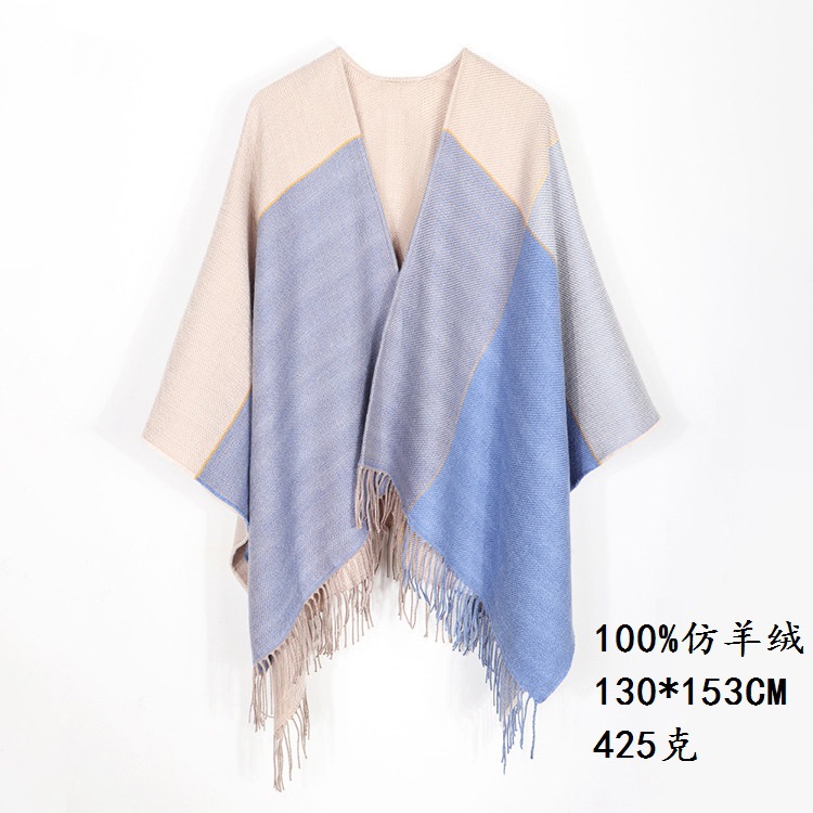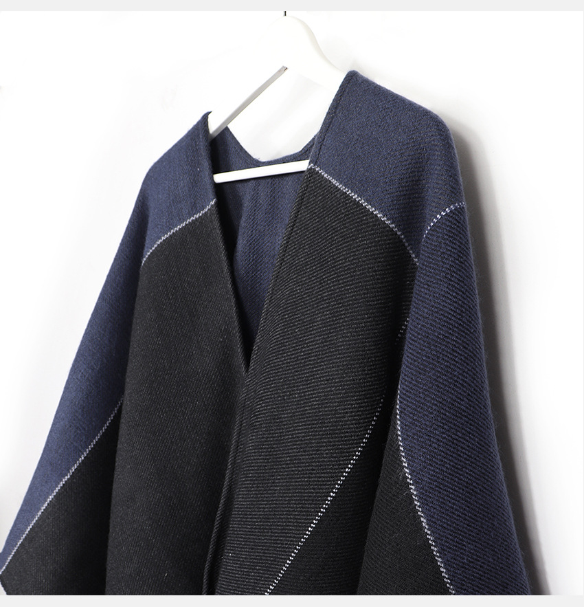 秋冬厚款蓝色大色块格子仿羊绒斗篷披风加绒加厚女大尺寸开叉厂家